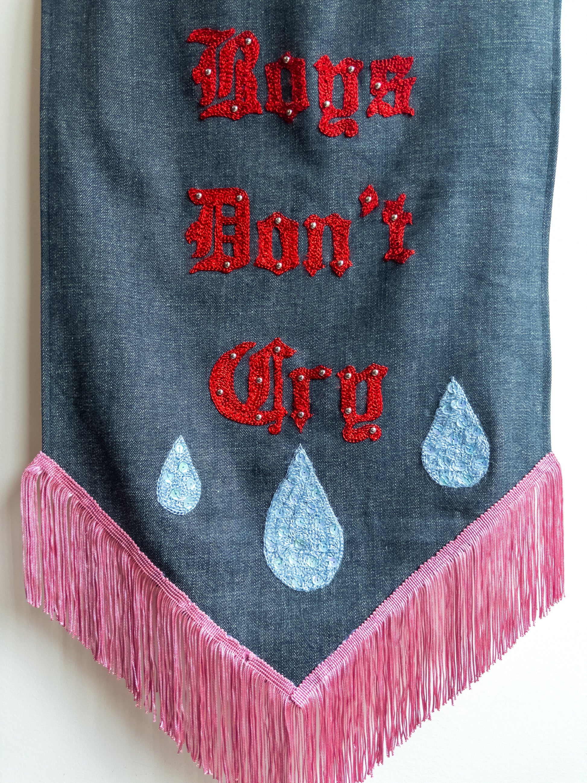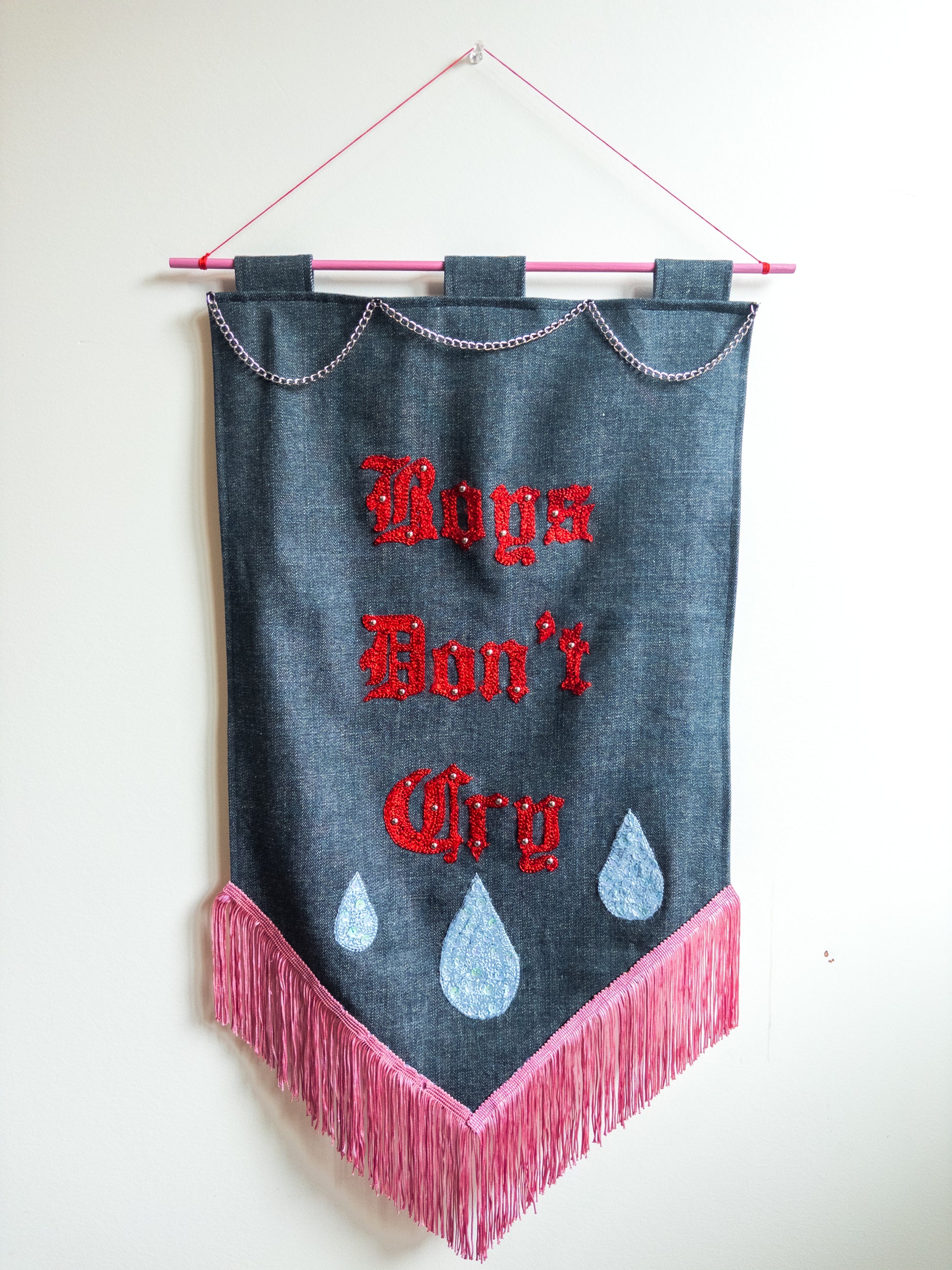 Handmade wall banner sewn, chainstitched and beaded and studded by me. Hand dyed fringe. Featuring Cure lyric "Boys Don't Cry".